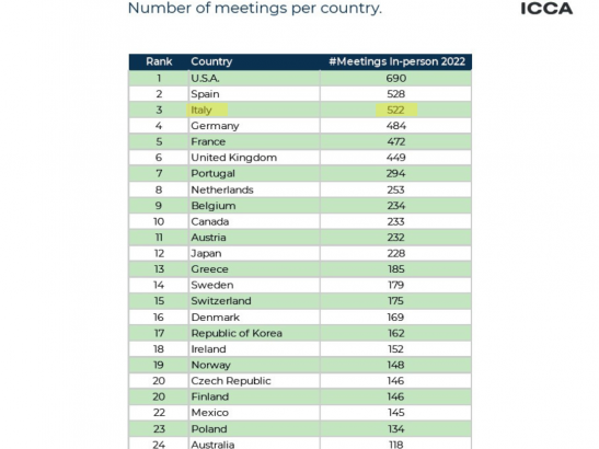La destinazione è inoltre entrata nella Top 30 in Europa, ottenendo il 27° posto (nel 2018 era al 46°), ed è salita anche nella classifica nazionale, superando Firenze e Torino e raggiungendo il podio: solo Roma e Milano la precedono nella Top 3 in Italia. Ottimi risultati anche per l’Italia, che è passata dal 6° posto ottenuto nel 2018 al 3° posto nel 2022, davanti a Germania, Francia e UK, con ben 522 eventi organizzati - soltanto sei in meno rispetto alla Spagna, seconda classificata.