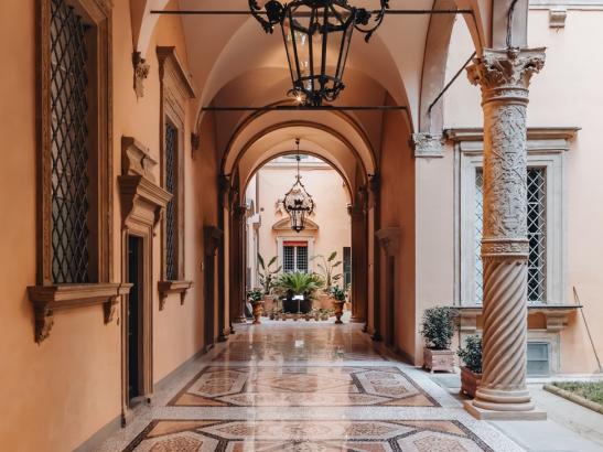 Palazzo Boncompagni è situato in pieno centro storico, a poche centinaia di metri da piazza Maggiore e dalle Due Torri. Il Palazzo, dove nacque Papa Gregorio XIII, si contraddistingue per la facciata di impianto cinquecentesco e il grande portale decorato. Il completamento e gli ornamenti del Palazzo sono attribuiti a Jacopo Barozzi mentre al Vignola sia la splendida scala elicoidale che la conclusione del loggiato con il portale d’accesso alla scala.